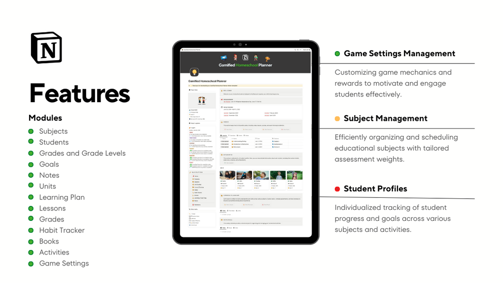 Unlock the full potential of your homeschooling journey with the Gamified Homeschool Planner Notion Template! This innovative template combines the best of organization and engagement, turning everyday lessons into exciting adventures. Transform your homeschool into a dynamic and interactive learning environment that fosters growth and curiosity.