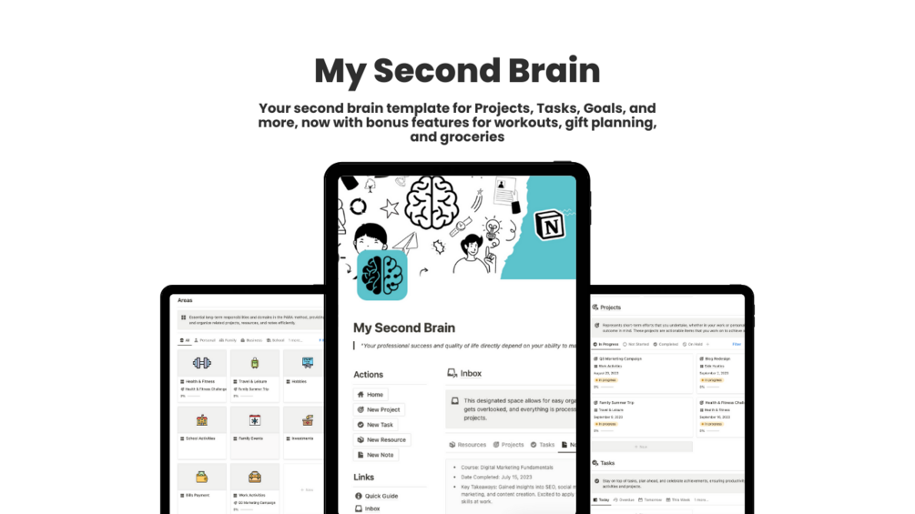 Discover the power of Building a Second Brain using the revolutionary PARA method by Tiago Forte. Elevate your productivity and organization to new heights with our comprehensive Notion template. Seamlessly manage projects, tasks, goals, and more, all while enjoying bonus modules that cater to your fitness tracking, gift planning, and shopping needs. π