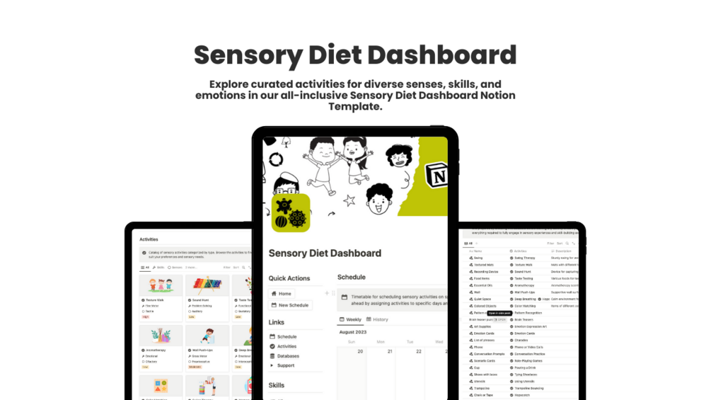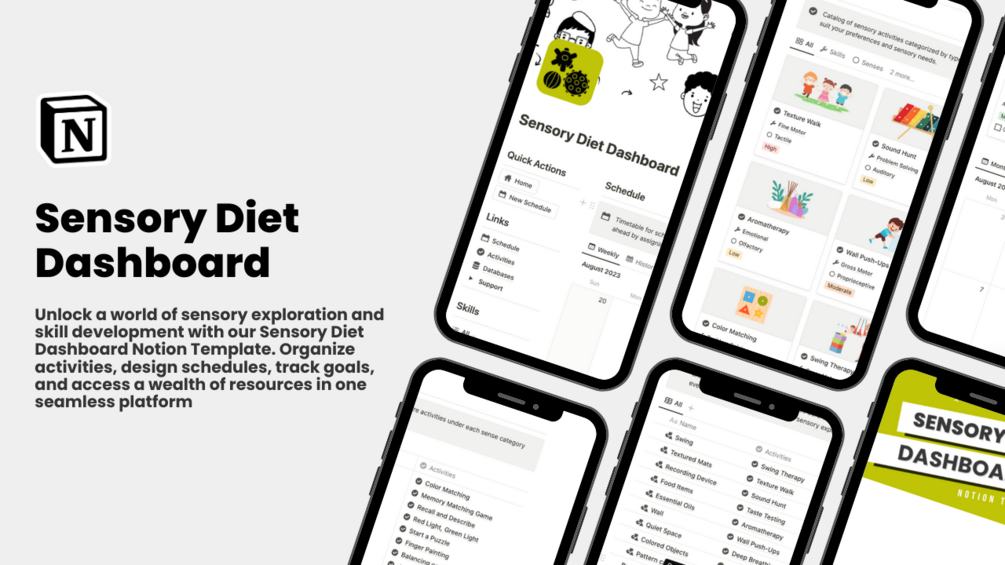Are you an occupational therapist, speech therapist, or a dedicated parent seeking to enhance sensory experiences and promote holistic development? Look no further. We're thrilled to present the "Sensory Diet Dashboard" Notion template—an invaluable toolkit designed to revolutionize the way you approach sensory engagement and skill-building.